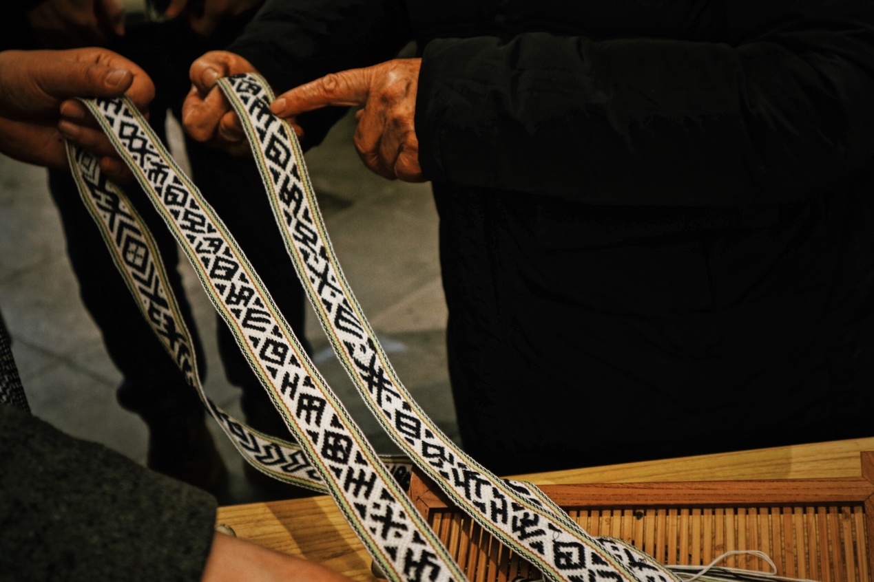 花带是江南地区的一项传统手工艺。过去,花带在上海人的日常生活中随处可见,人们日常用它来做腰带、包带、包袱带、背孩子的背带,甚至婚礼时封嫁妆也用它。杨美芳老师是上海奉贤人,她的青年时期就是在包括织花带在内的纺织生活中度过的。她十分热爱织花带,近些年来,在承袭传统的同时,她也根据当下新的社会生活语境做了许多创新。