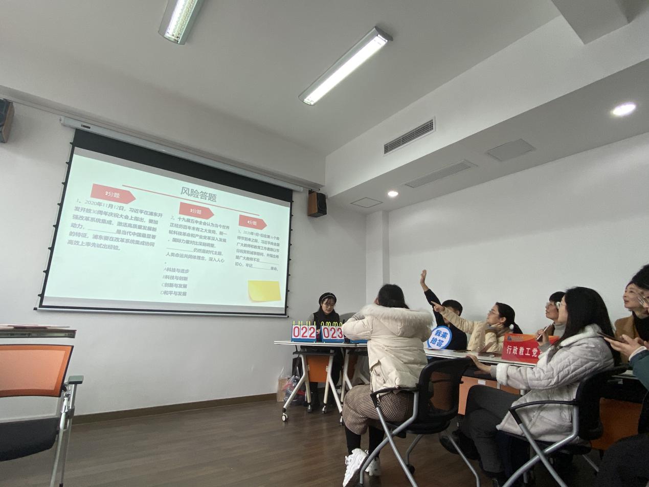 在必答题的热身后进入激烈的抢答题,每个支部都不甘落后积极争抢答题,虽然比赛中存在抢答违规以及答错的情况,但是老师们的积极性不减,都力争上游,三个支部的比分不分上下,旗鼓相当。