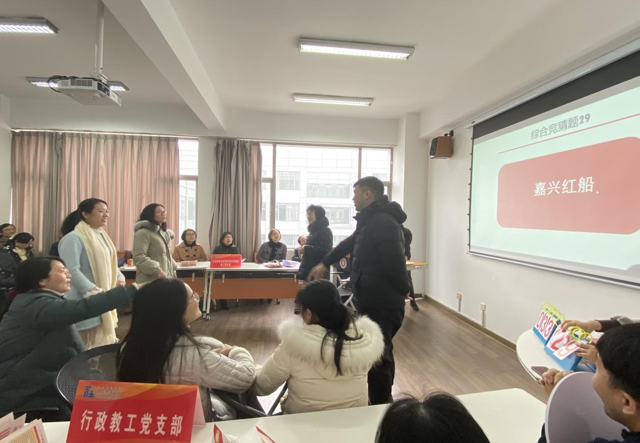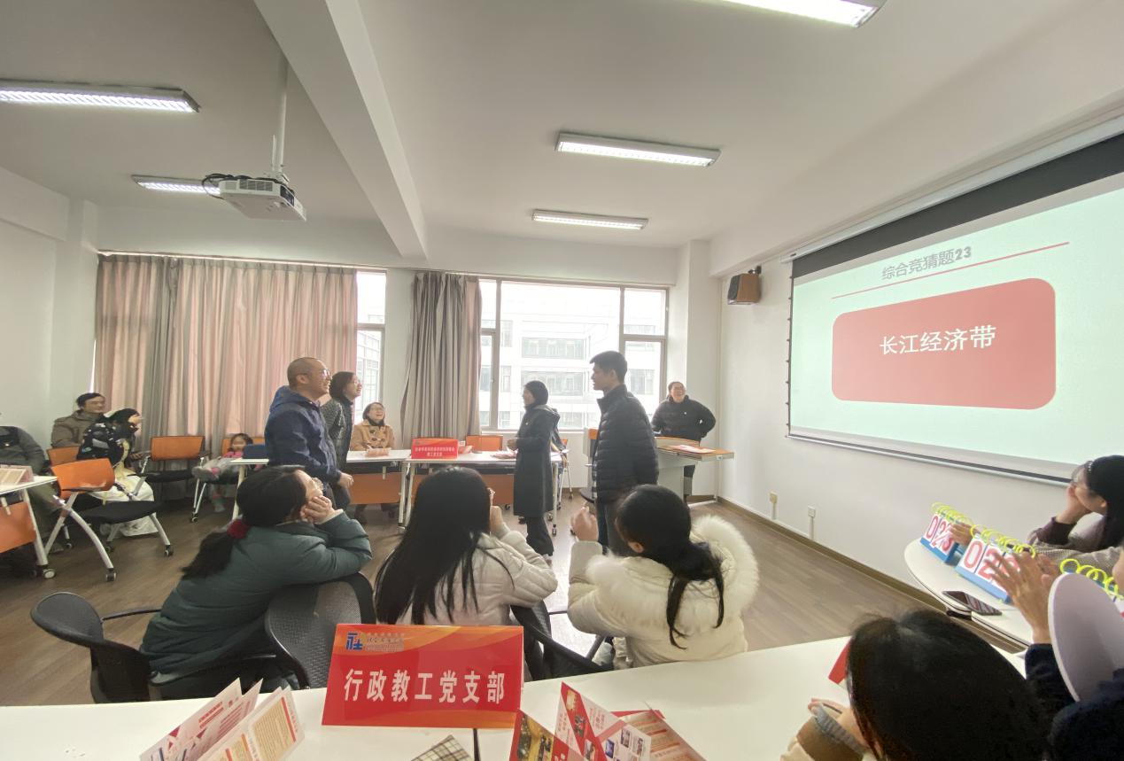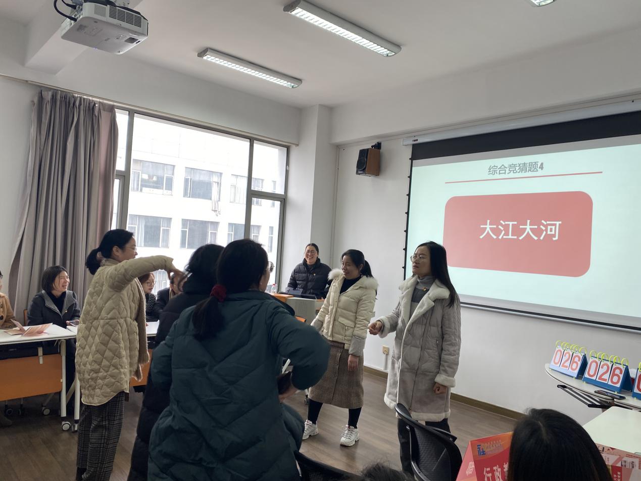 综合竞猜答题环节将整个比赛推向了高潮,老师们需通过语言、表情、动作传递信息,这不仅考验三个支部对知识的综合把握,也考验队友之间的默契度。在这一环节中“5G时代”“英雄城市”“人类命运共同体”“嫦娥五号”等新时代的关键词不断涌现,题目难度也是不断升级,场面一度非常火热。