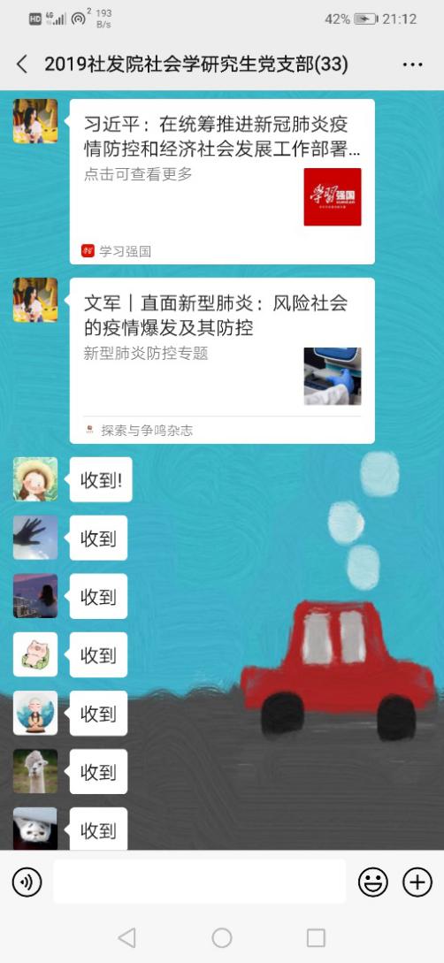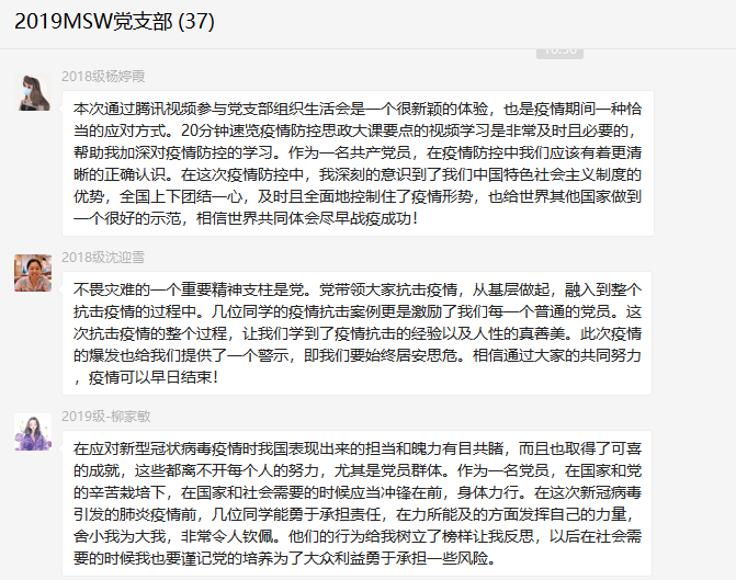 社会工作硕士研究生党支部邀请支部党员花雅霏、袁枫、王皓、刁祈月四位同学,讲述他们在抗疫一线担任志愿者的经历和心得体会。一线抗疫的党员分享结束后,其它支部党员分别以在线语音和群内文字两种方式进行了充分的交流。此外,支部党员还共同学习了习近平总书记在统筹推进新冠肺炎疫情防控和经济社会发展工作部署会议上的重要讲话精神,并观看了《20分钟速览疫情防控思政大课要点》。