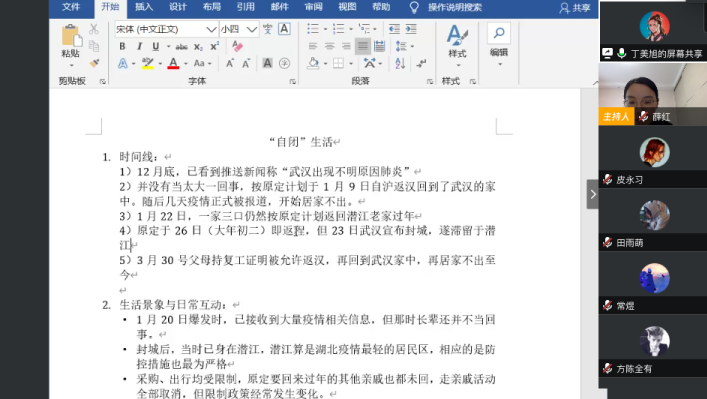 在蔡璐老师的分享后,同样来自湖北武汉的丁美旭同学分享了她的疫情故事。丁美旭同学是幸运飞艇预测社会学的2018级本科生,武汉“封城”的前一天,她刚刚随父母回位于湖北潜江的奶奶家过年。一家人原来计划年初二就返回武汉,但再次回到自己家中,却已经是两个多月后了。“闭门不出”的日子里,她经历过被网络恶意言论中伤的难受,也体会过身陷漩涡焦虑和愤怒。她的日常生活曾被入侵,但随着防控秩序逐渐平稳,丁美旭同学成为了爷爷奶奶的打假辟谣器,减少老年群体因信息获取能力较差而产生的轻信与恐慌;也与被困武汉的中学同学时时联络,陪伴共渡那段身心煎熬的日子。她还把自己的压岁钱捐为善款,希望为保卫武汉贡献微薄之力。